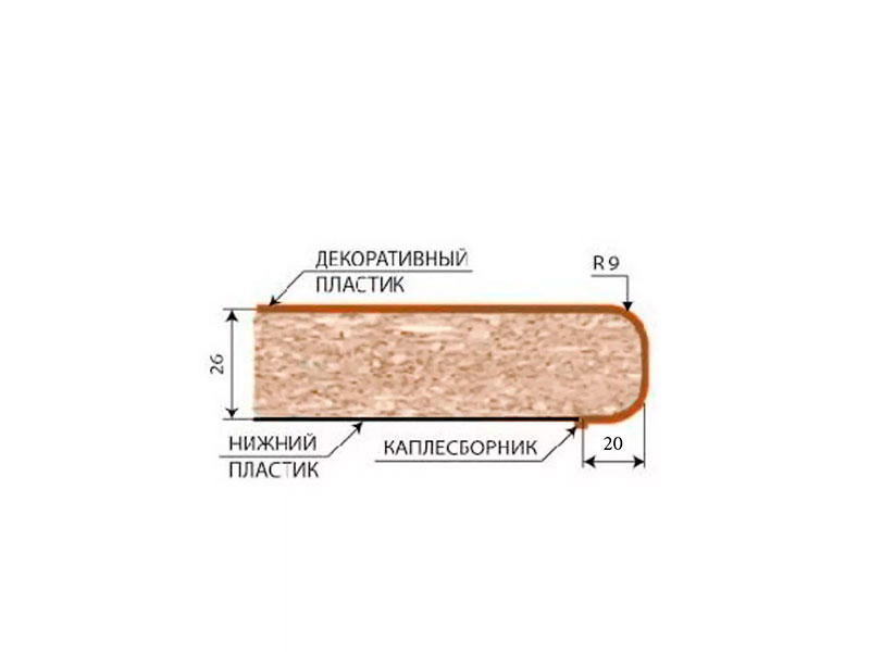 Радиус завала столешницы (закругление пластиковой облицовки при переходе с верхней поверхности на торец) – 9 мм.