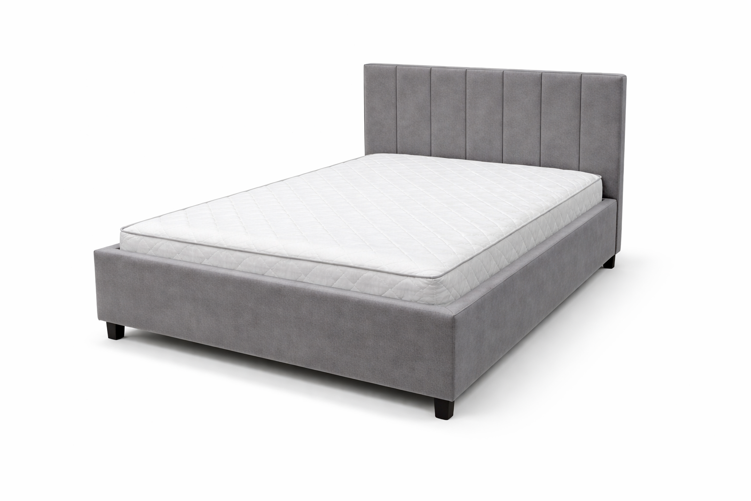 120:200 кровать Без поъемного механизма с серым обивочным материалом. Кровать оснащена высоким изголовьем, состоящим из пяти вертикальных панелей, что придает ей элегантный и стильный вид. Кровать стоит на небольших черных ножках, что придает ей современный и минималистичный вид.